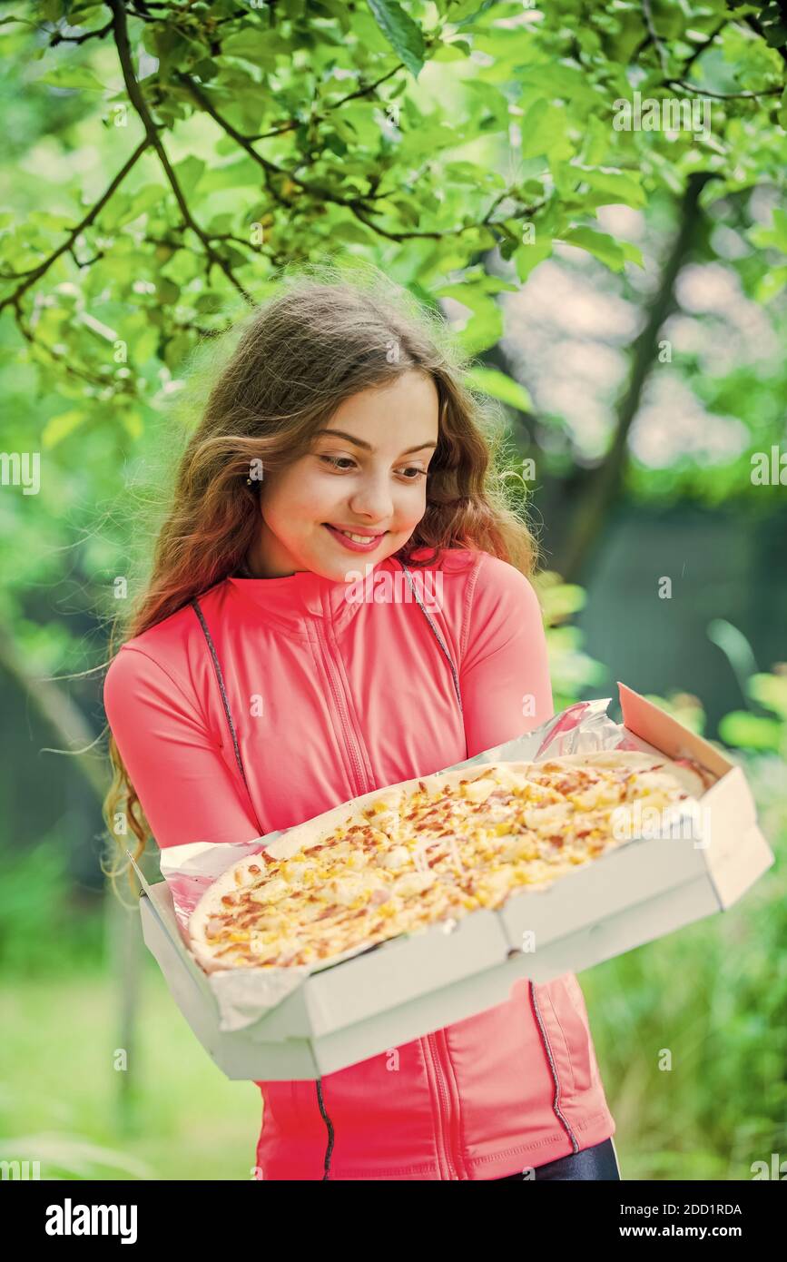 Juicy Pizza Unhealthy And Healthy Food Happy Childhood Child Feel Hunger Hungry Kid Going To Eat Italian Pizza Fast Food Concept Happy Childrens Day Little Girl Eating Pizza Pizza Delivery Stock Photo